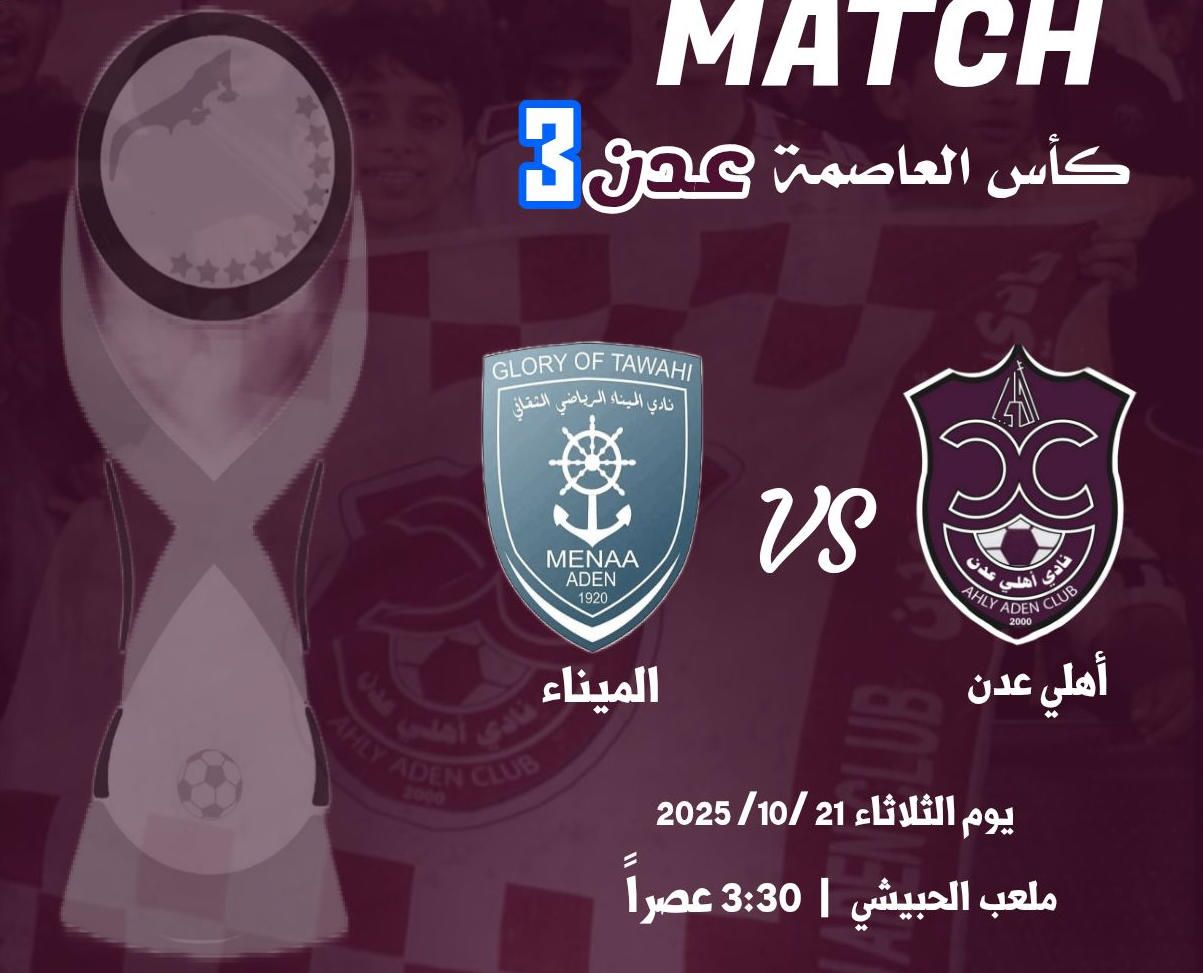 ويشهد ملعب الحبيشي مواجهة مرتقبة بين فريقي أهلي عدن والميناء، على أن يلتقي الفائز منهما مع الفائز من لقاء الجلاء والتلال.