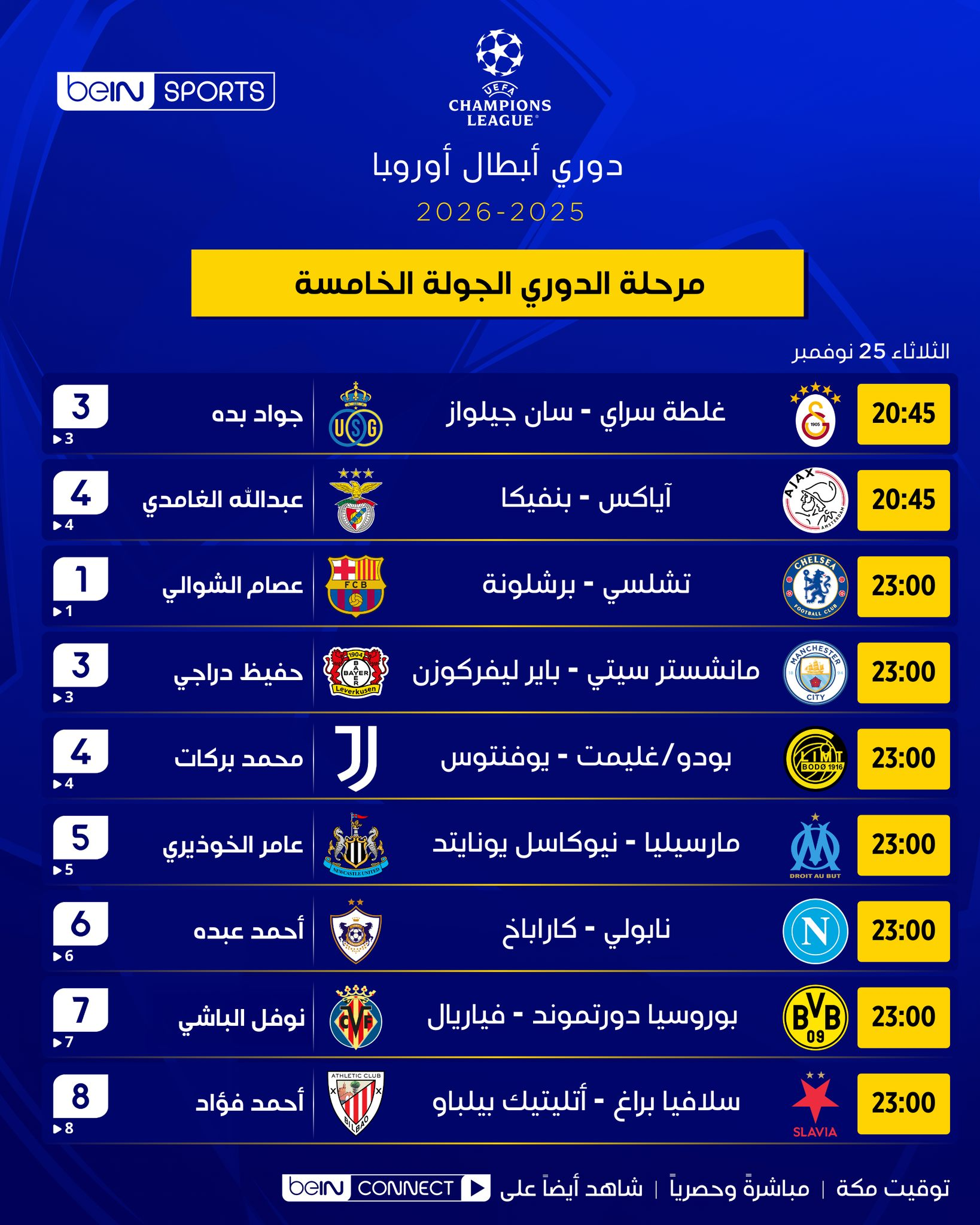 وفي بقية المواجهات، يستقبل غلطة سراي فريق يونيون سانت جيلواز، ويلتقي مارسيليا مع نيوكاسل يونايتد، ويواجه سلافيا براغ فريق أتلتيك بلباو، فيما يلعب نابولي ضد قراباغ أغدام.
