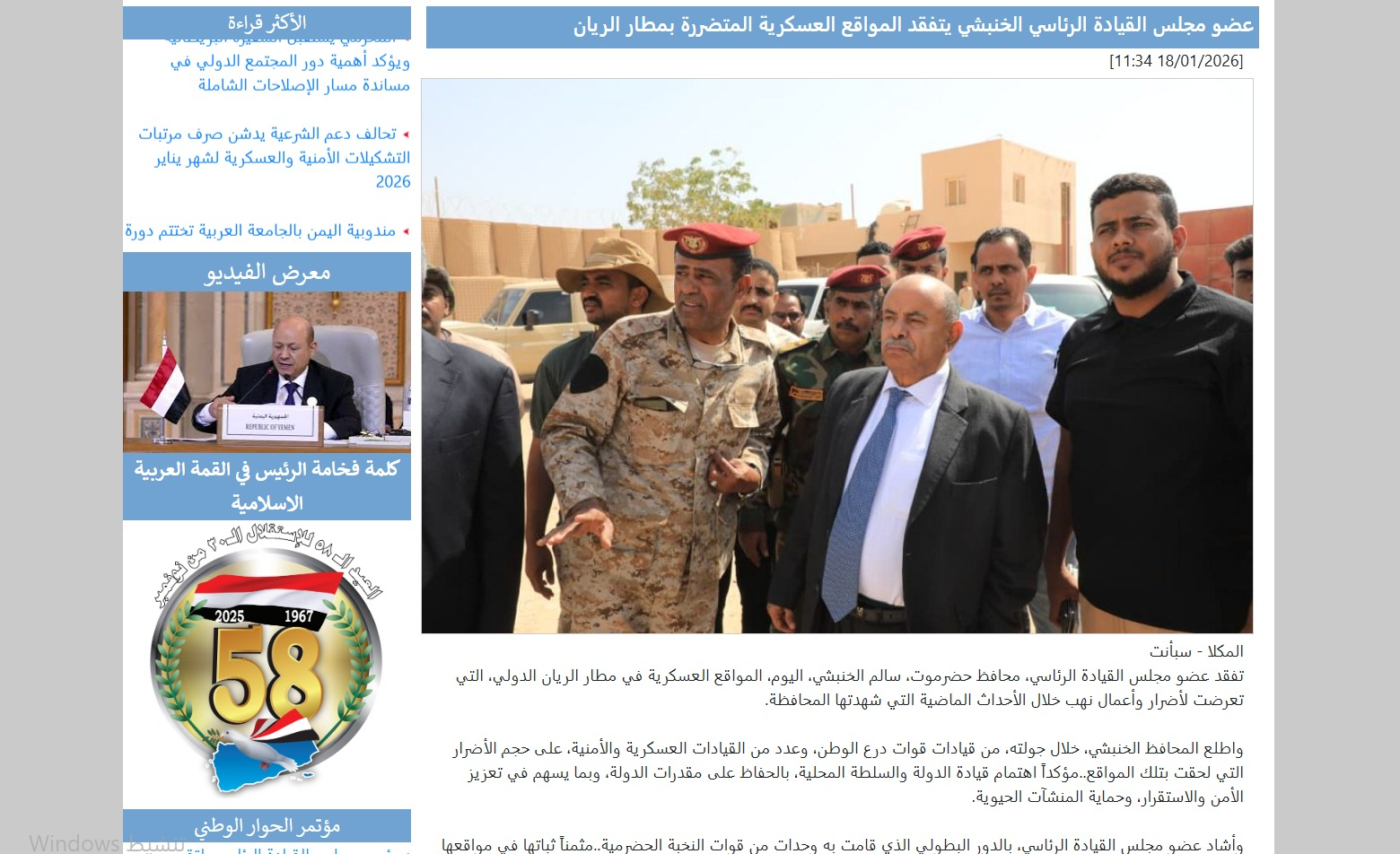 وبحسب ما نشرته وكالة "سبأ" الرسمية، فقد قام الخنبشي، الأحد الماضي، بزيارة تفقدية لمواقع عسكرية في مطار الريان الدولي، "التي تعرّضت لأضرار وأعمال نهب خلال الأحداث الماضية التي شهدتها المحافظة".