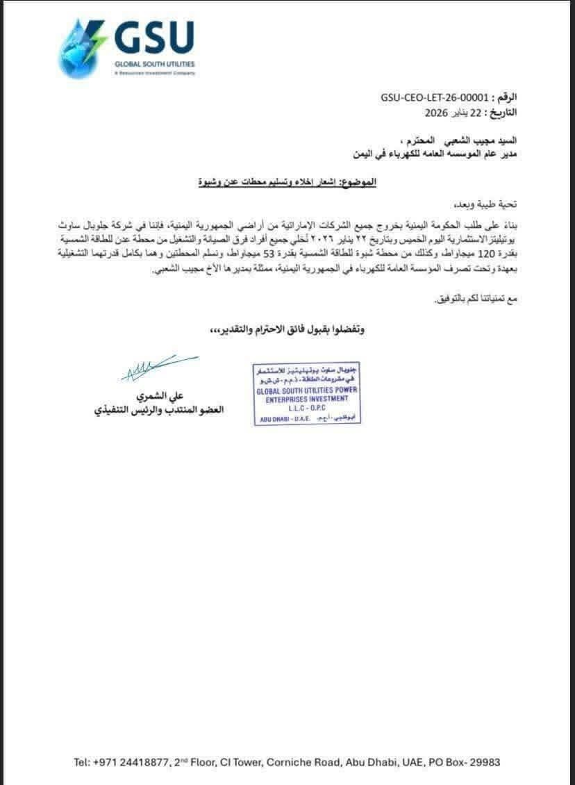 وبحسب الرسالة المؤرخة 22 يناير 2026، والموجّهة إلى مدير عام المؤسسة العامة للكهرباء في اليمن، المهندس مجيب الشعبي أوضحت شركة GSU أن قرار توقف محطات الطاقة الشمسية جاء بناءً على طلب رسمي من الحكومة اليمنية يقضي بخروج جميع الشركات الإماراتية من أراضي الجمهورية اليمنية.