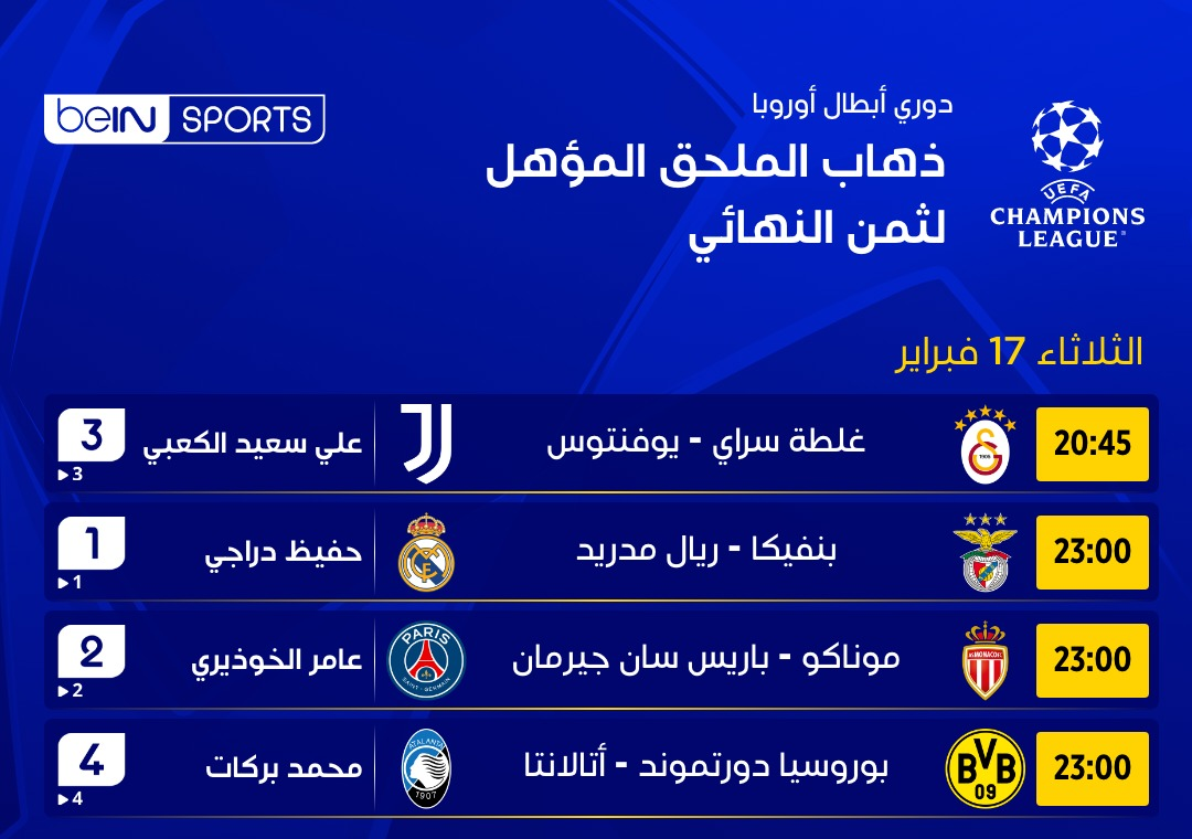 وفي بقية مباريات اليوم، يستقبل غلطة سراي التركي، يوفنتوس الايطالي، فيما يحل اتالانتا الايطالي ضيفاً على بروسيا دورتموند الالماني.