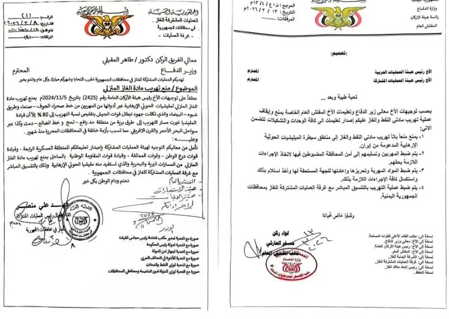 حيث وجّه رئيس غرفة العمليات المشتركة للغاز، فهد منصور، خطاباً إلى وزير الدفاع، طاهر العقيلي، كشف فيه عن وجود عمليات تهريب للغاز المنزلي من المناطق المحررة إلى مناطق سيطرة مليشيا الحوثي.